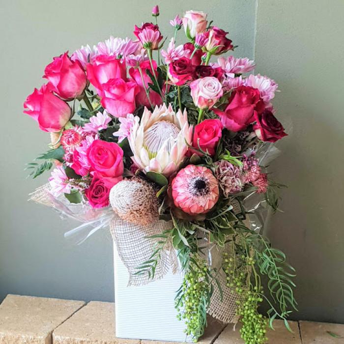 An elegant modern boxed arrangement that will have heads turning! Featuring a blend of seasonal blooms, natives, roses and chrysanthemums why not spoil a special someone with this perfect gift. For a very modern sweetie!