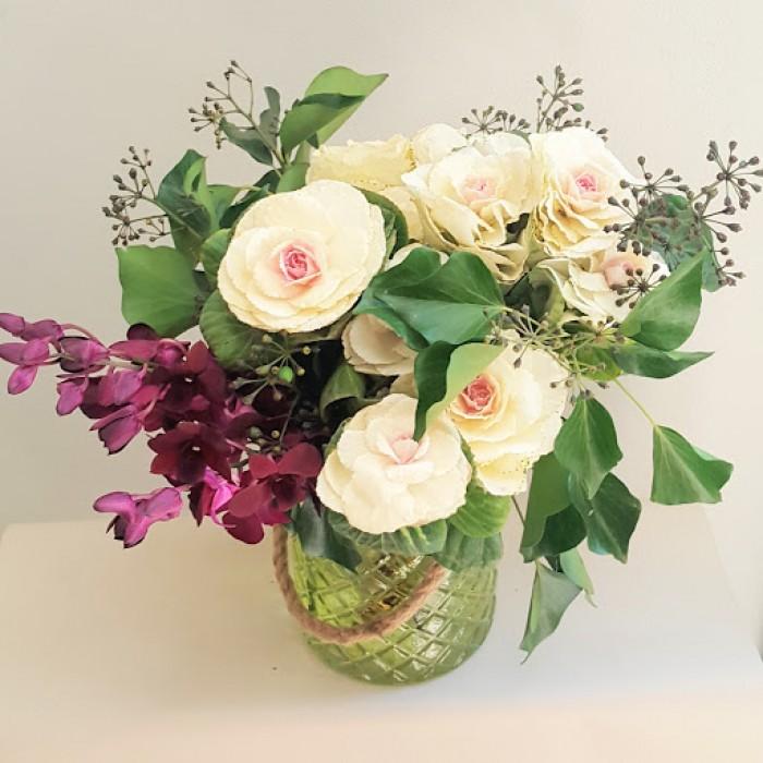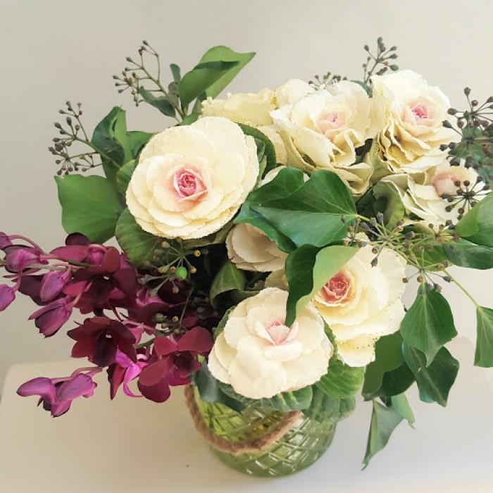 A delightful arrangement of ornamental kale and maroon Singapore orchids in an elegant green vase. Makes a great gift for all manner of occasion