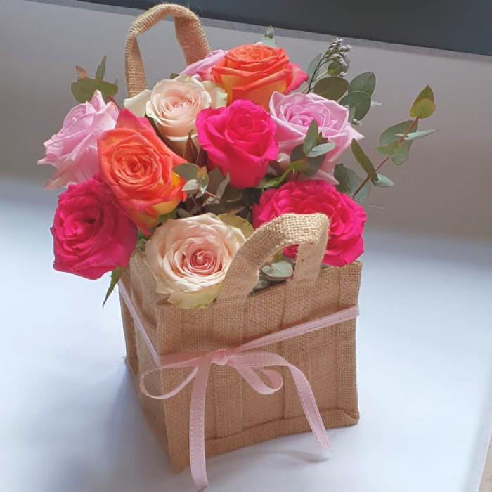 A lot of happiness makes up this hessian gift bag full of colourful blooms and will delight your senses.