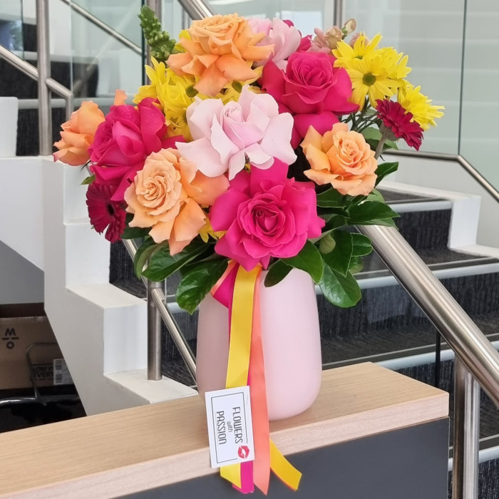 Meet Alani, a cheery mix of bright colored florals. Presenting a mix of roses, chrysanthemums, and greenery in a vase to really make those flowers stand out! Make someone's day with this colorful arrangement. A great gift for any occasion. And why not add a little pizazz with some of our great value add-ons. Order online today for next day delivery.