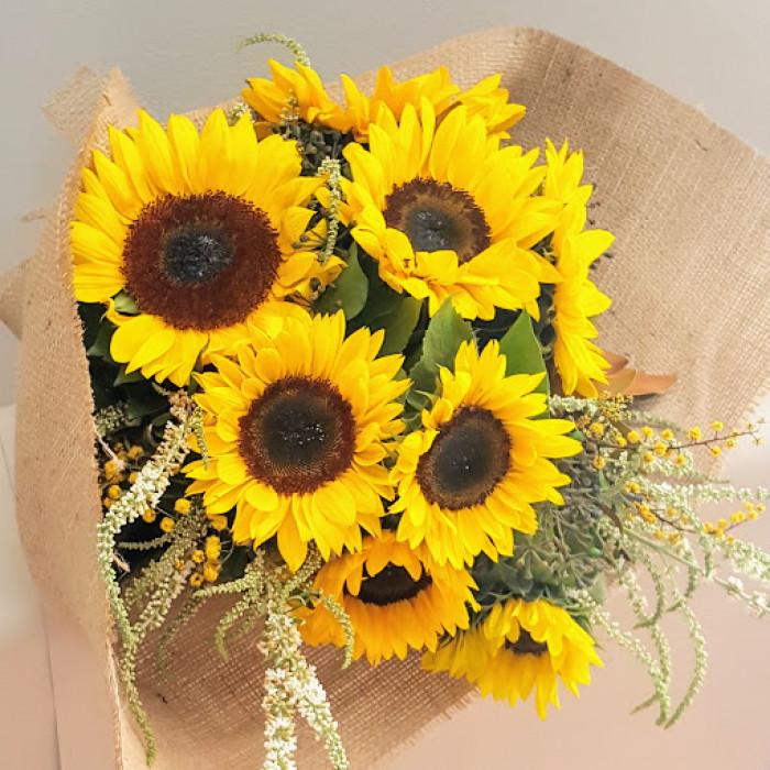The Flowers with Passion team have crafted this delightfully bright combination of yellow sunflowers with seasonal foliage. This arrangement is ideal as a gift or to brighten up a room.
