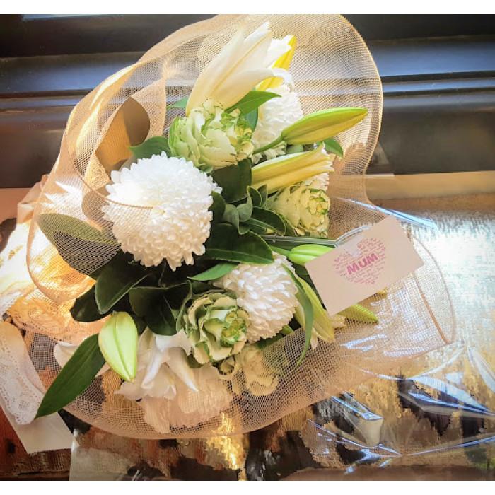 An enchanting bouquet of white lilies, green and white kale and white disbuds in a bed of lush green foliage. This arrangement is ideal for any occasion. Available as a bouquet or in a vase.